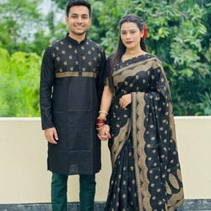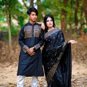 💖 লাভ বার্ড কাপল কম্বো 20 (শাড়ি + ম্যাচিং পাঞ্জাবি + ব্লাউজ পিস)