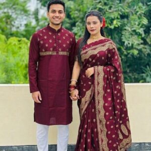 💖 লাভ বার্ড কাপল কম্বো 23 (শাড়ি + ম্যাচিং পাঞ্জাবি + ব্লাউজ পিস)